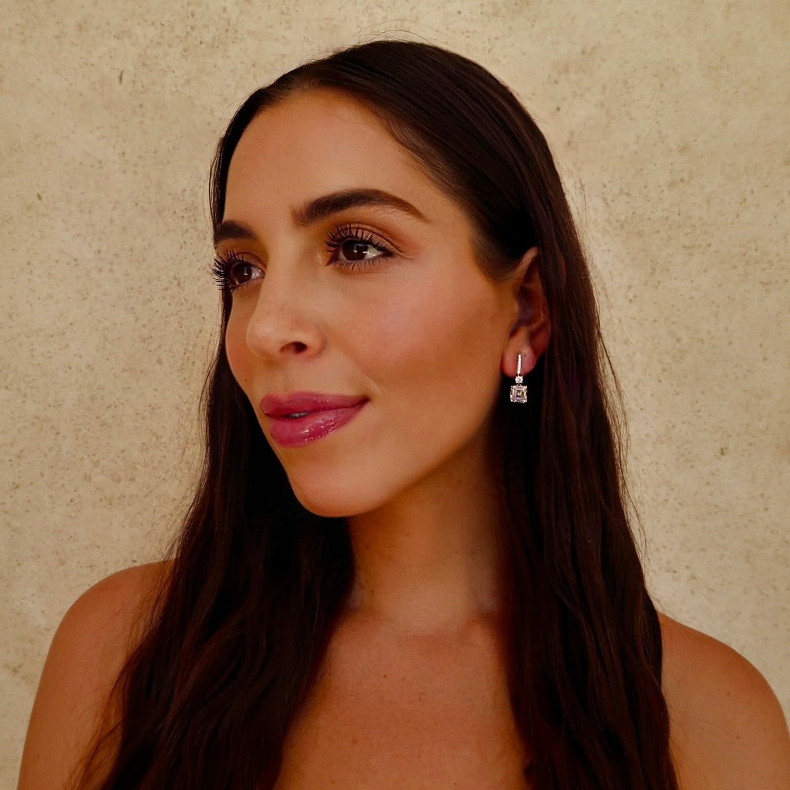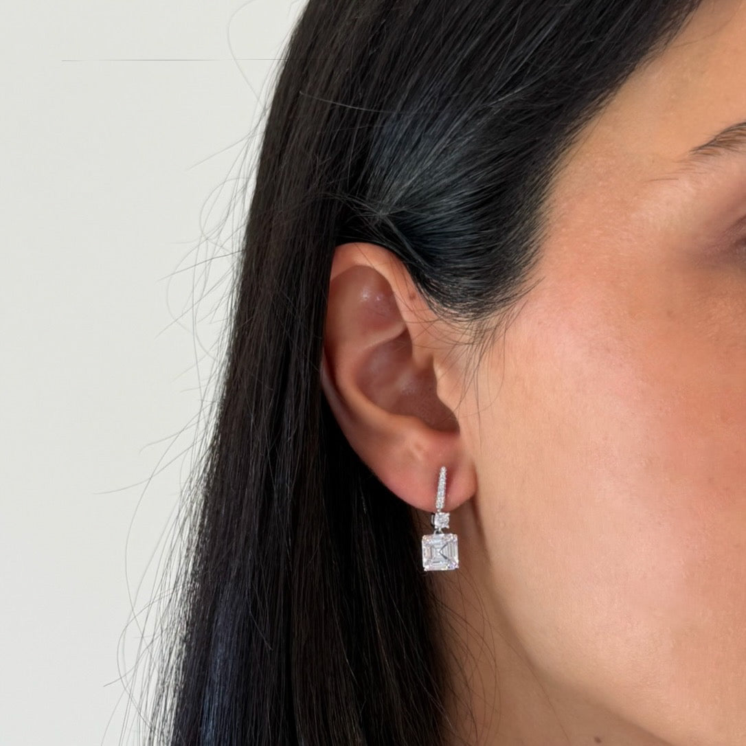 These earrings exude luxury and glamour. The pave drop adds a touch of elegance, while the square-cut stone offer a unique and eye-catching focal point.