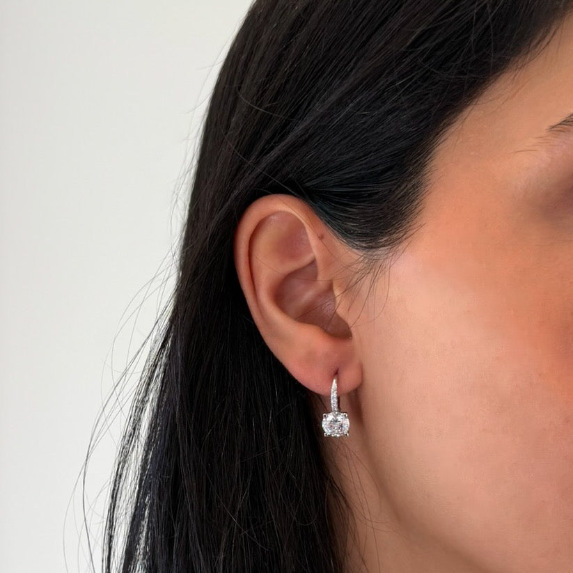 These clip drop earrings that feature a grand brilliant round-cut center stone set in a four-prong setting, suspended from a sleek, pavé-accented hoop. A timeless silhouette and sophisticated charm perfect for any occasion.